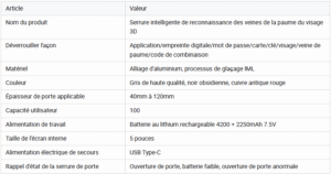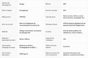 Note de sécurité : En cas de batterie faible, une alarme retentit et un port USB de secours permet d’alimenter la serrure pour entrer. Deux clés mécaniques sont également fournies.