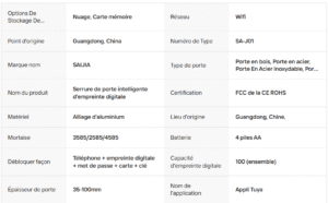 | Modes d’accès | Empreinte, Code PIN, Application Tuya, Carte RFID, Clé physique |